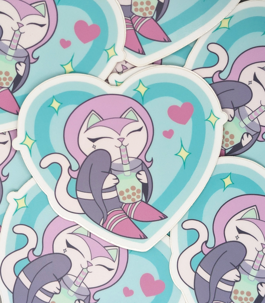 Cute Boba Cat Heart Sticker Heavy Duty Vinyl 3"