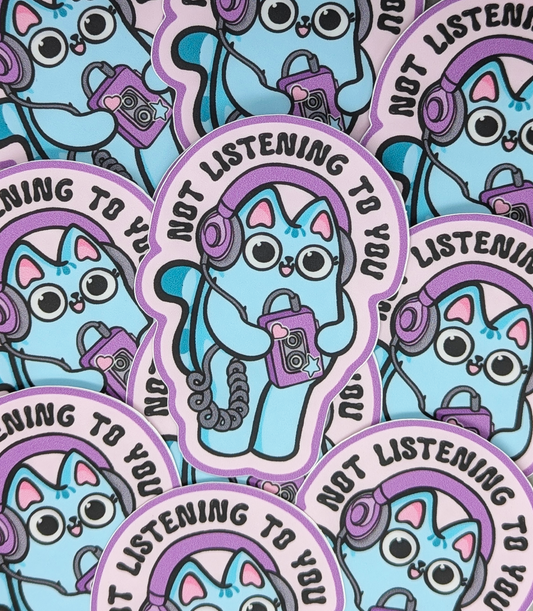 Not Listening to You Cat Cassette Tape Player Sticker Heavy Duty Vinyl 3"